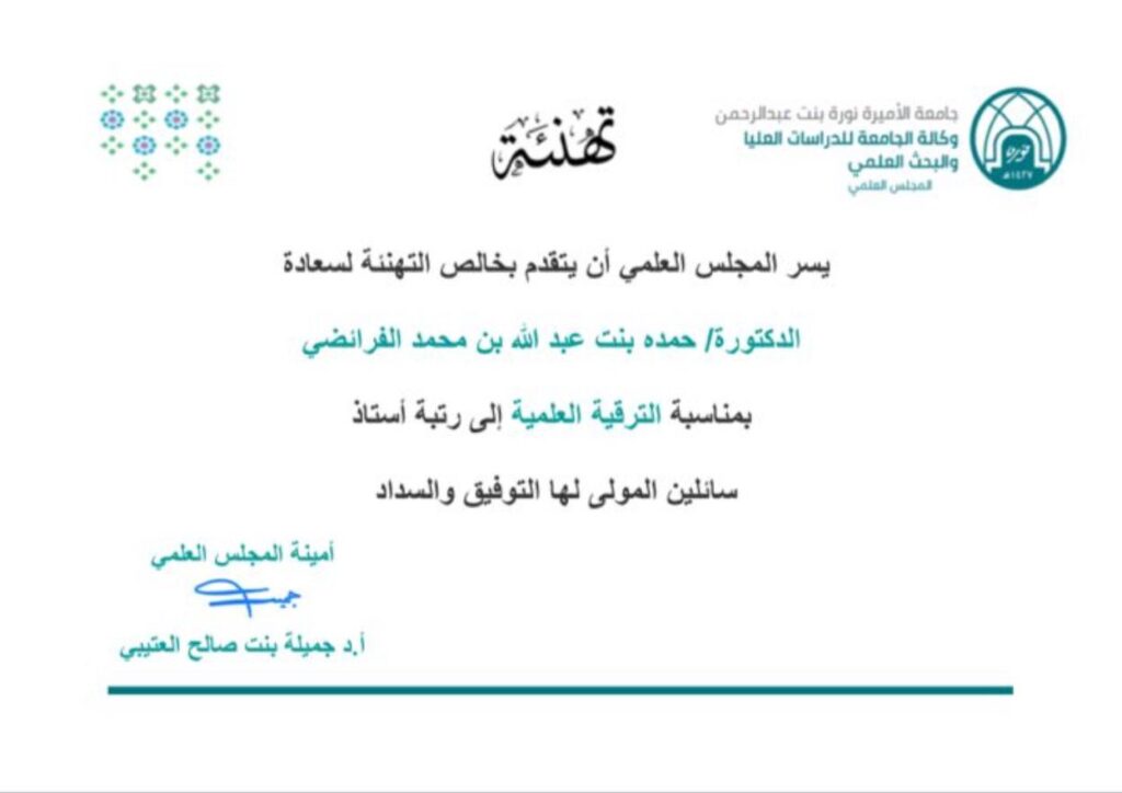 أصدر المجلس العلمي بجامعة الأميرة نورة بنت عبدالرحمن موافقته على ترقية الدكتورة حمده بنت عبدالله الفرائضي إلى درجة أستاذ “بروفيسور” في تخصص الخدمة الاجتماعية بكلية العلوم الإنسانية والاجتماعية بالجامعة في الرياض.