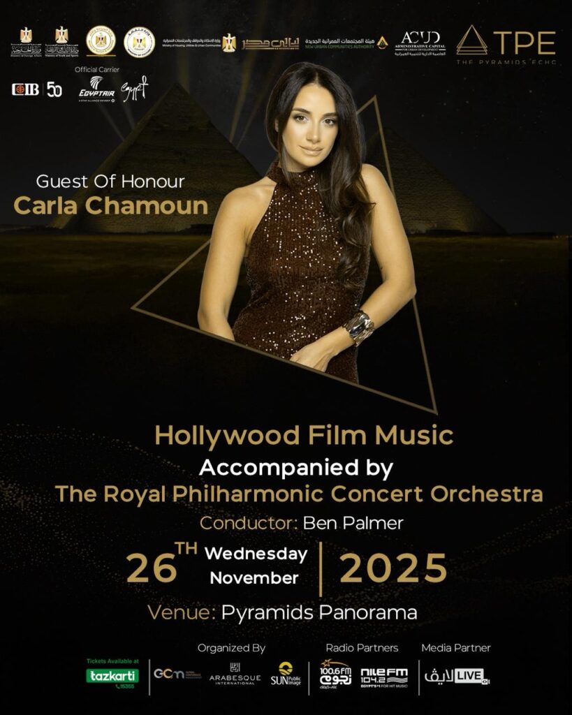 تشهد الجيزة ليلةً استثنائية في 26 نوفمبر 2025، حيث تقدّم الفنّانة اللبنانيّة كارلا شمعون عَرْضًا غير مسبوقٍ تحت سفح الأهرامات، وتُؤدّي للمرّة الأولى في الوطن العربيّ أغنيات Gladiator بصوتها مع الأوركسترا الملكيّ البريطانيّ –