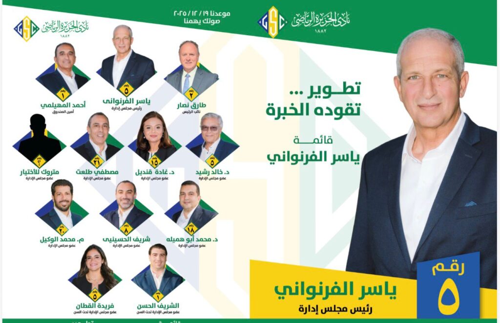 أعلن ياسر أحمد الفرنواني ترشحه رسميًا لمنصب رئيس مجلس إدارة نادي الجزيرة الرياضي (رقم 5) في الانتخابات المقررة في 19 ديسمبر 2025، وذلك على رأس قائمة انتخابية تحمل شعار «تطوير… تقوده الخبرة».