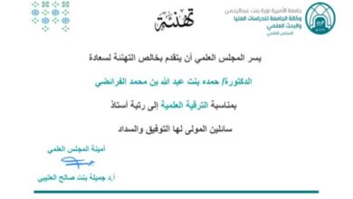 البروفيسورة حمده الفرائضي تترقى إلى درجة أستاذ بجامعة الأميرة نورة بنت عبدالرحمن